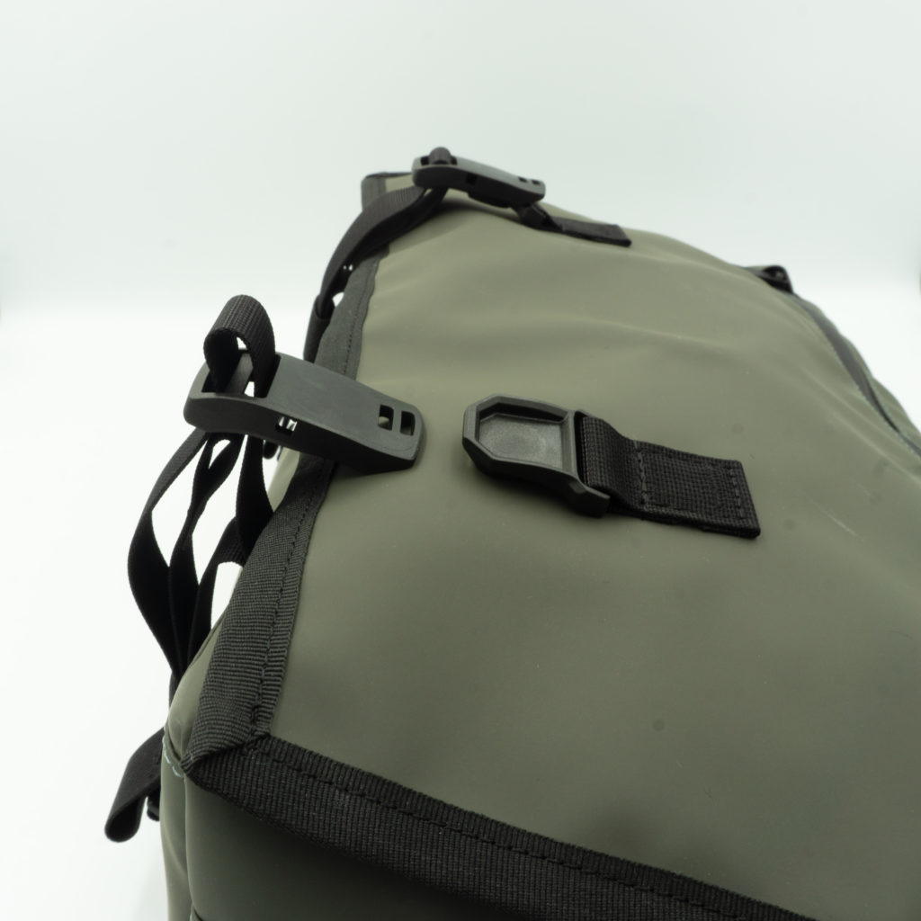 バックの底面にはコンプレッションストラップを搭載しています。荷物が少ない時はベルトを締めることで体積を圧縮し、バックの揺れを防ぎます。