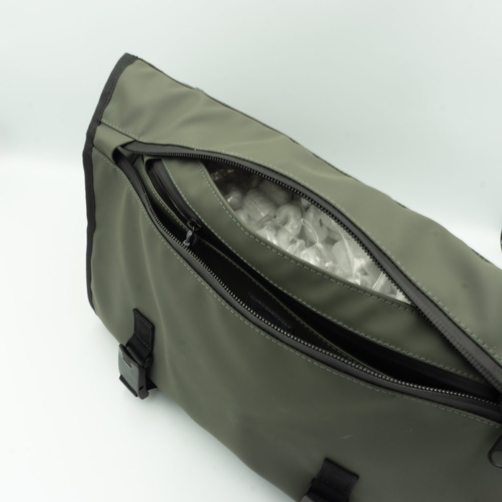 ※防水生地と止水ファスナーを使用しており、小雨や水しぶき程度であれば内部への水の侵入を防ぎますが、完全防水ではないため長時間の雨や水への浸漬が想定される場合は、中のアイテムをビニール袋に入れるなど、バック内部での防水対策をおすすめします。